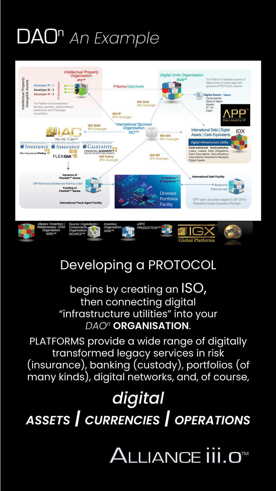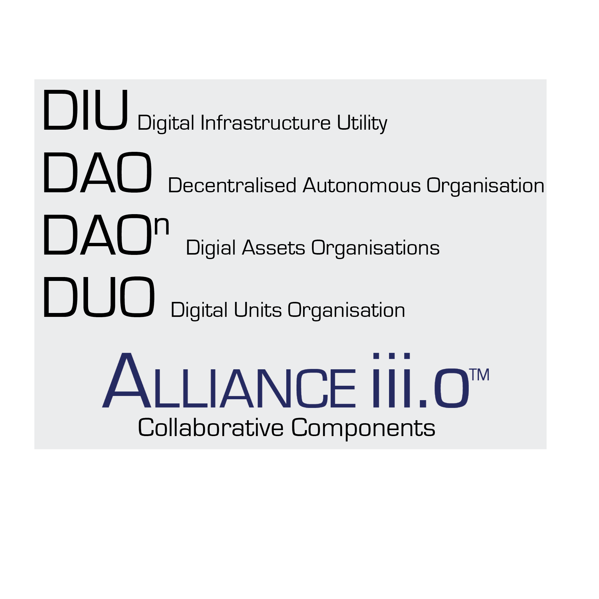 Decentralised Autonomous Organisations provide a range of relationship connectivity and collaboration infrastructure, digitally connecting Ecosystem participants, information, equipment and transactional functionality. An Initiative and its Ecosystems DAOs, are registered and connected to IGX and OneGlobal Connectivity networks. DAOs are generally designed to be ajurisdictional. A DAO acts as a registry service under the Alliance iii.o Protocol.